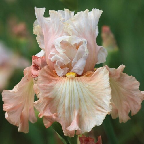 Herbaceous perennial with sword-shaped grey-green leaves growing to 60cm and flower stems up to 90cm tall. Flowers have peach to cream, softly ruffled upright (standard) and lower (falls) petals. The beard in the throat is a soft orange. Each flower stem produces up to 9 flower buds in late spring or summer. Flowers mid to late season. A long lasting cut flower.