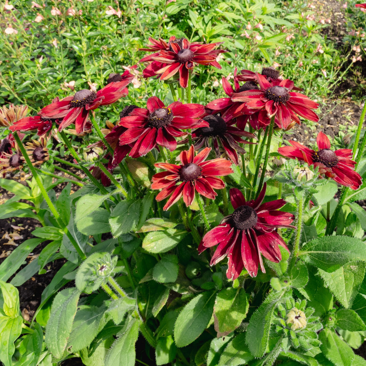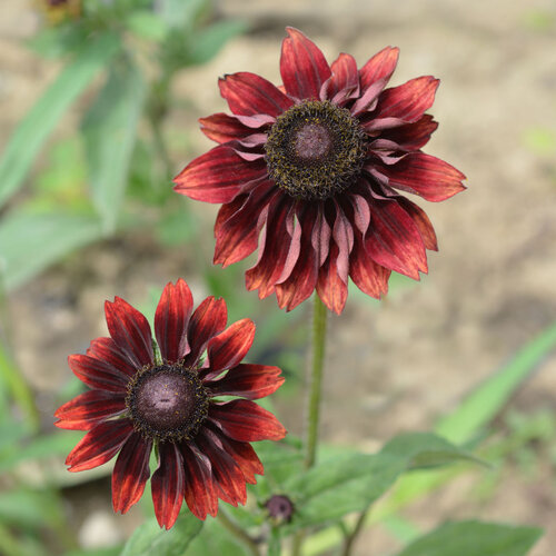 A biennial, often grown as an annual with bristly leaves and stems growing 60-75cm. Daisy-like flower heads with warm, rich red and chocolate petals surrounding a central cone appear in summer and autumn.