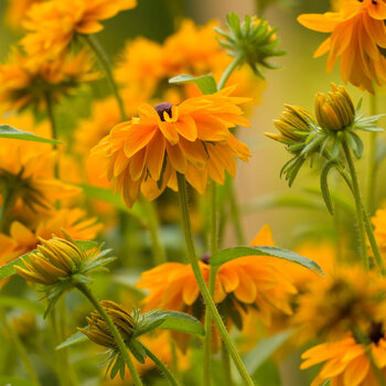 A biennial, often grown as an annual with bristly leaves and stems growing 50-100cm. Large, double or semi-double, daisy-like flower heads with rich golden-yellow petals surrounding a dark brown central cone appear in summer and autumn.