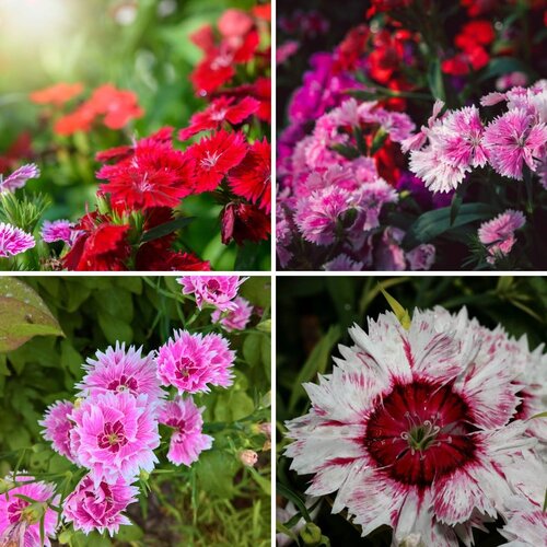 A mix of large, double flowers with fringed petals in shades of red, pink, white, and bi-colours. Often grown as an annual, they flower over a long period throughout summer. The masses of scented flowers are ideal in beds, borders, as container plants, and as cut flowers. Also known as China Pinks.