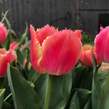 Double fringed tulips have spectacular flowers with finely fringed edges to their petals that are often described as 'crystal-edged'. The flowers bloom mid season on sturdy, 30cm tall stems. For the best display plant in groups of at least 5 in containers or garden beds.
