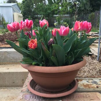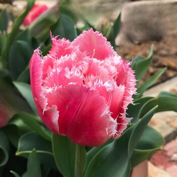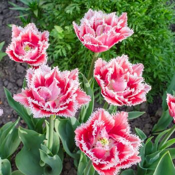 Double fringed tulips have spectacular flowers with finely fringed edges to their petals that are often described as 'crystal-edged'. The flowers bloom mid season on sturdy, 30cm tall stems. For the best display plant in groups of at least 5 in containers or garden beds.
