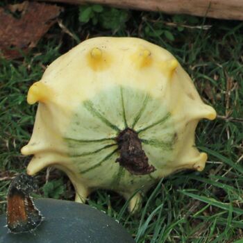 An ornamental gourd with decorative fruit with ribs and curved points reminiscent of a small crown. Fruit grows to around 10cm across in a variety of colours, from creamy white to yellow and dark green, usually with a striped pattern.
