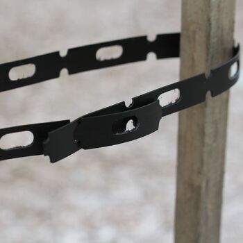Heavy duty interlocking chain for tying medium and large trees to stakes, suspending hanging baskets and bundling stakes and canes. Easy to secure tie that can easily be tightened and can also be reused. Flexible but strong black plastic to avoid bruising and stem damage on tree trunks from rubbing.