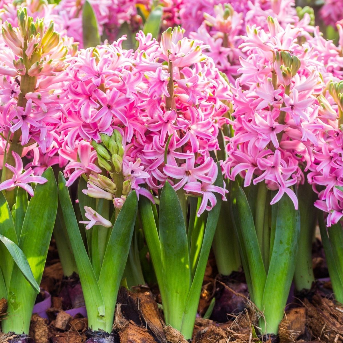 Hyacinths bloom on upright stems with hundreds of highly perfumed flowers clustered on each stem. They flower early in spring and are suited to growing in pots where they can be enjoyed outdoors or brought inside once flowers begin to open. Hyacinths can be planted individually in small pots, grouped in containers for a more dramatic display, or planted at the front of a border or en masse in the garden.