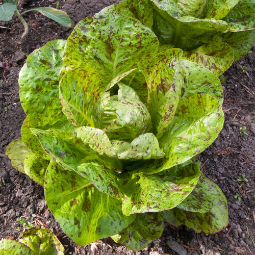 An heirloom romaine (cos) variety with mid-green leaves freckled and blotched with burgundy. The crisp leaves are mild-flavoured and slow to become bitter. Harvest leaves as a cut-and-come-again crop, or allow plants to mature and harvest as a full head. Lettuce leaves can also be cooked like a green vegetable in stir fries. First bred in Austria in the late 18th century, the German name "Forellenschluss" refers to the burgundy marks on the leaves that resemble the speckles on a trout.