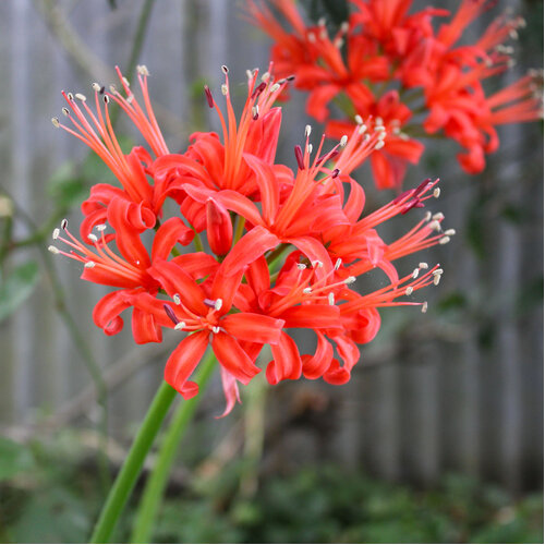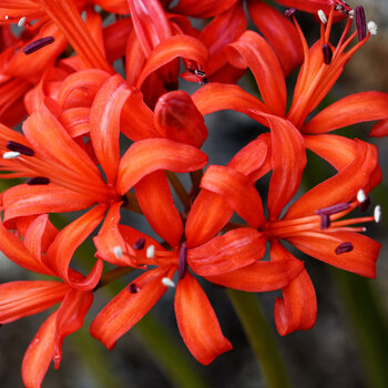 Hardy perennial bulb with heads of brilliant orange-red, gold-dusted flowers on straight stems. The flowering stems are 45-50cm tall and each flower head has 5-10 individual flowers. Bulbs are summer-dormant and flowering stems appear in autumn before the leaves.