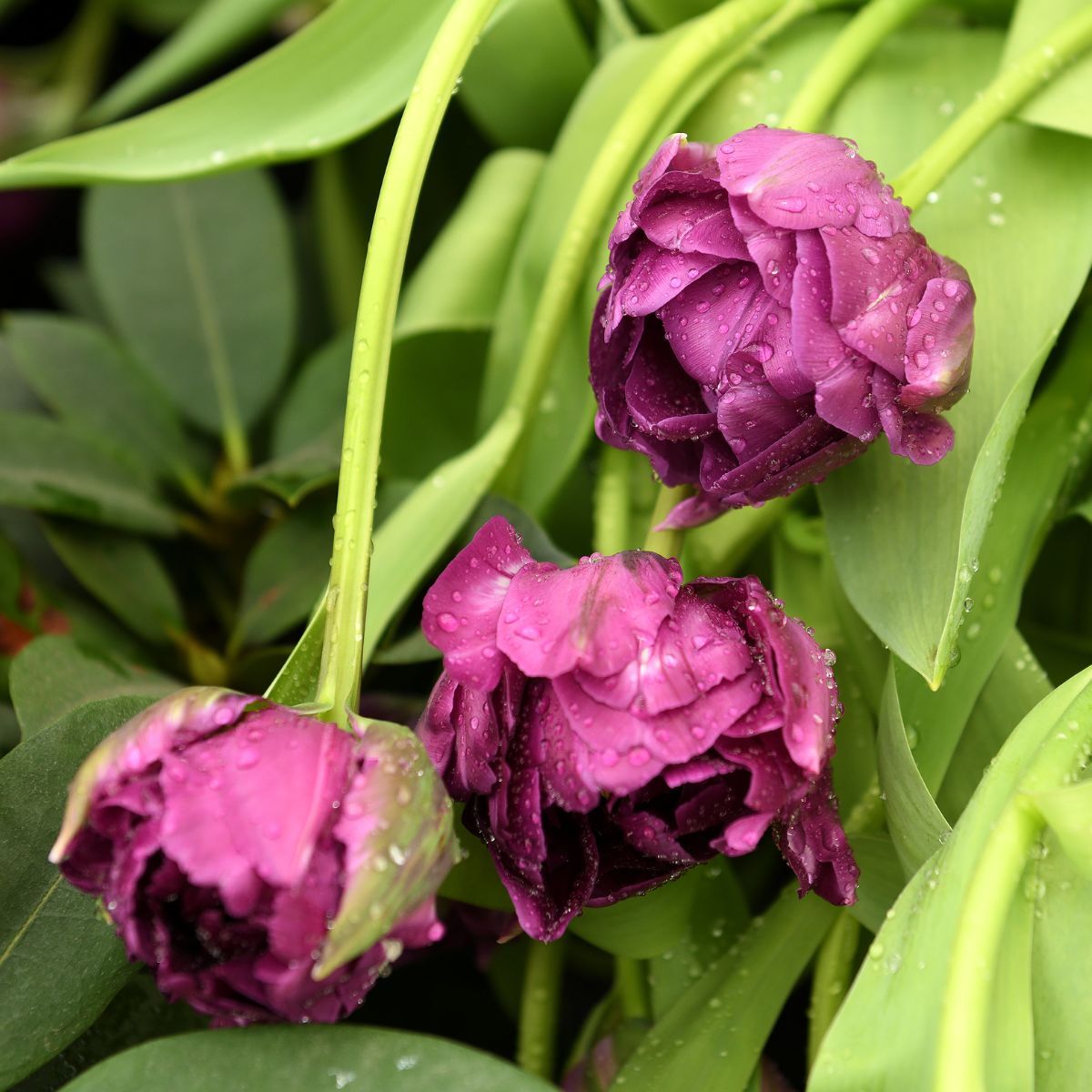 A parrot tulip with a dramatic combination of plum coloured petals with green-streaked outer petals. The showy flowers have feathered and ruffled petals and are held on 25cm stems. Flowers mid season.