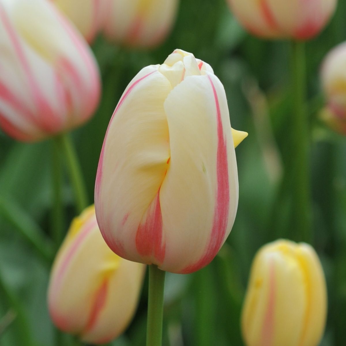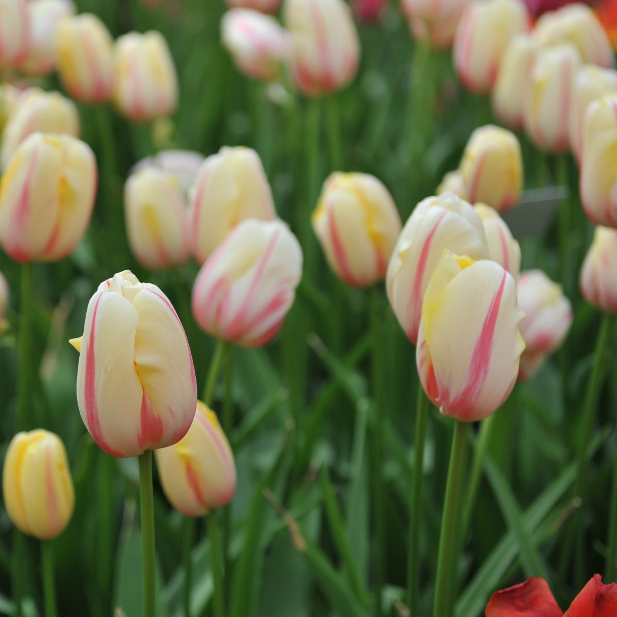 Elegant pale yellow to ivory flowers with dark pink-red stripes running through the petals. Tall 65cm stems. Flowers late season.