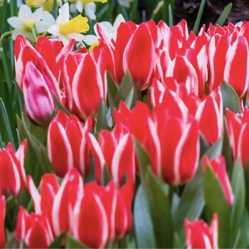 A bicoloured tulip with very large flowers held on 45cm stems. The raspberry red petals are edged in creamy white. Flowers mid season.