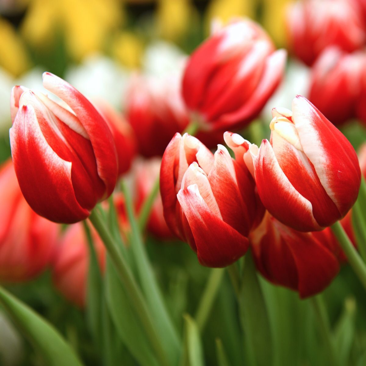 - Red petals edged in creamy white