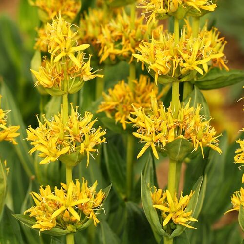 A perennial herb growing to 100cm high with large lance-shaped leaves and clusters of long-lasting pure yellow flowers. A slow-growing herb that grows in full sun or part shade in consistently moist soil. Also known as Great Yellow Gentian, Bitter Root or Bitterwort, the long tap root is traditionally used medicinally to aid digestion and treat fevers, and as a bittering agent.